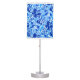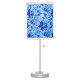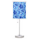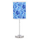 Lamp in a vintage William Morris floral print of stylized lilies and Irises, digitally enhanced and colored, in shades of deep cobalt blue, cerulean blue, and light sky blue on a white background