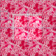 Fabric in a vintage William Morris floral print of stylized lilies and Irises, digitally enhanced and colored, in shades of light to deep fuchsia pink and deep wine red on a white background