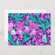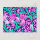 Postcard in a William Morris, Art Nouveau, textile print of irises and leaves, digitally enhanced and colored, in soft orchid and turquoise, on a deep amethyst purple background