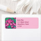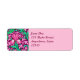 Labels in a William Morris, Art Nouveau, textile print of irises and leaves, digitally enhanced and colored, in fuchsia and ice pink, peacock green, and white, on a deep wine purple background
