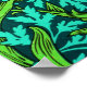 Print in a William Morris, Art Nouveau, textile print of irises and leaves, digitally enhanced and colored, in orange, lime green, and soft aqua, on a deep turquoise background