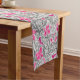 Table runner in a William Morris, Art Nouveau, textile print of irises and leaves, digitally enhanced and colored, in fuchsia and light pink, with graphite and medium gray / grey leaves, on a light silver gray background