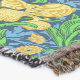 Throw in a William Morris, Art Nouveau, textile print of irises and leaves, digitally enhanced and colored, in golden yellow, green, and soft blue, on a deep cobalt blue background