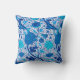 Throw pillow in a William Morris, Art Nouveau, textile pattern - elegant, stylized, chrysanthemums, sunflowers and leaves, in shades of turquoise, cobalt, and navy blue, on a white background