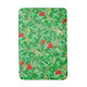 Bath mat in a William Morris Art Nouveau textile pattern of lychee tree branches and leaves, in shades of lime and deep green, accented with red lychee fruits and yellow blossoms, on a light green background