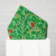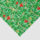 Tissue paper in a William Morris Art Nouveau textile pattern of lychee tree branches and leaves, in shades of lime and deep green, accented with red lychee fruits and yellow blossoms, on a light green background