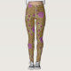 Leggings in a vintage William Morris, Art Nouveau, marigold damask print of leaves and flowers, digitally enhanced and colored, in shades of light brown and beige, accented with violet purple and pink, on a dark chocolate brown background
