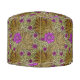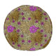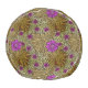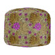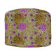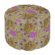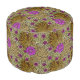 Pouf in a vintage William Morris, Art Nouveau, marigold damask print of leaves and flowers, in shades of light brown and beige, accented with violet purple and pink, on a dark chocolate brown background