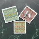 Three color variations on the William Morris 1878 fabric pattern Peacock and Dragon.