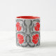 Mug in a vintage William Morris textile pattern of stylized pimpernel flowers and leaves - flowers in a gradient of dark to bright red, with graphite gray / grey leaves, on a light silver gray background