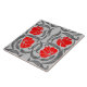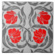 Ceramic tile in a vintage William Morris textile pattern of stylized pimpernel flowers and leaves - flowers in a gradient of dark to bright red, with graphite gray / grey leaves, on a light silver gray background