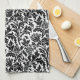 Kitchen towel in a vintage William Morris damask pattern of thistle flowers and leaves, in black, on a white background, digitally enhanced and colored