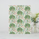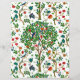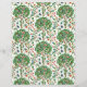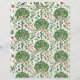 Paper in a William Morris Art Nouveau take on a traditional "tree of life" pattern, featuring fantasy trees surrounded by branches filled with exotic flowers and birds, shades of emerald green, tan, gold, red, and turquoise blue, on a white background