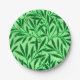 Paper plates in a William Morris Art Nouveau textile pattern of stylized willow branches and leaves in shades of deep jade green on a light jade green background