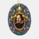 On this Ornament is a portrait of the author William Shakespeare. The portrait is in an oval gold frame with ribbons and a crown on top. The blue background wallpaper is decorated with castles, kings' crowns and yellow and red flowers, bringing to mind the romance, tragedy and comedy of his plays and poetry. Makes a lovely Christmas tree ornament, or the perfect stocking stuffer gift for fans of the Bard.