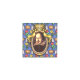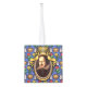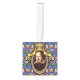 The Bard - The original design on this Wood Cube Ornament is a portrait of the author William Shakespeare. The portrait is in an ornate oval gold frame with ribbons and a crown on top. The blue background wallpaper is decorated with castles, kings' crowns and yellow and red flowers, bringing to mind the romance, tragedy and comedy of his plays and poetry.