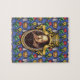 The Bard - On this puzzle is a portrait of the author William Shakespeare. The portrait is in an ornate oval gold frame with ribbons and a crown on top. The blue background wallpaper is decorated with castles, kings' crowns and yellow and red flowers, bringing to mind the romance, tragedy and comedy of his plays and poetry.