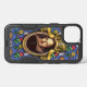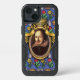 The Bard - The original artwork by ZoeSPEAK on this OtterBox iPhone 13 Case features a portrait of the author William Shakespeare. The portrait is in an ornate oval gold frame with ribbons and a crown on top. The blue background wallpaper is decorated with castles, kings' crowns and yellow and red flowers, bringing to mind the romance, tragedy and comedy of his plays and poetry.
