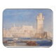 Rhodes. Joseph Mallord William Turner (1775 – 1851). A lovely seascape in pink and blue tones. In the foreground are boats and ships in the bay near the city walls. in the middle ground there is a high tower. In the background there is a city with stone houses. Reproduction of famous works of art images in the public domain.