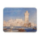 Rhodes. Joseph Mallord William Turner (1775 – 1851). A lovely seascape in pink and blue tones. In the foreground are boats and ships in the bay near the city walls. in the middle ground there is a high tower. In the background there is a city with stone houses. Reproduction of famous works of art images in the public domain.