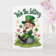This card shows a friendly leprechaun perched on a smooth gray rock, dressed in an emerald suit and matching top hat with a shiny gold buckle and a small four-leaf clover pinned near his chest 💚. His bright blue eyes and rosy cheeks pair with a long white beard, and the gentle curve of his smile suggests he’s sharing a private joke with someone close by. He holds a slim, dark little pipe up to his lips, as if pausing mid-thought or whispering something sweet under his breath. Around him, short green grass and small pink flowers with sunny yellow centers create a cozy scene that feels like an inviting spot for two friends to linger. Several four-leaf clovers float above in different green shades, adding a light, lucky sparkle ☘️. Near the top, the words “Win the lottery” sit prominently in green cursive lettering against the white background. The illustration is framed by crisp outlines, with the clovers scattered like confetti across the upper space.