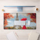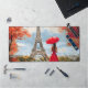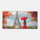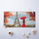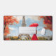 A graceful woman with a red umbrella strolls toward the Eiffel Tower in a soft autumn breeze. Romantic Parisian charm in glowing red and gold tones.