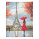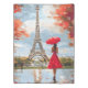 A graceful woman with a red umbrella strolls toward the Eiffel Tower in a soft autumn breeze. Romantic Parisian charm in glowing red and gold tones.