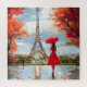 A graceful woman with a red umbrella strolls toward the Eiffel Tower in a soft autumn breeze. Romantic Parisian charm in glowing red and gold tones.