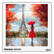 A graceful woman with a red umbrella strolls toward the Eiffel Tower in a soft autumn breeze. Romantic Parisian charm in glowing red and gold tones.