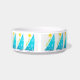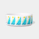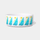 For sailing kitties, to go with their peoples' tableware...the original artwork by ZoeSPEAK on this small Water Bowl has a tropical feel and features twelve wind filled turquoise sails on marine blue waves under bright yellow suns. On the sails are circular white shapes like reflected ripples on the water. Under the suns, along the diagonal edges of the sails, are the words "sail away", in lime green. In the center of the design is a pink paw print over marine blue text which reads "Moriah's Water Bowl". This text is set to personalize with your own pet’s name or delete if you wish. A fresh and breezy look for a kitten on a boat, in a cottage at the beach, a tropical island...