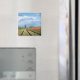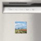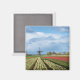 Souvenir photo magnet with a landscape with a windmill and yellow and red tulips under a cloudy sky in the Dutch countryside on a beautiful springtime day in the Bulb Region, the Netherlands.