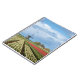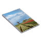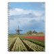 Notebook with a landscape with a windmill and yellow and red tulips under a cloudy sky in the Dutch countryside on a beautiful springtime day in the Bulb Region, the Netherlands.