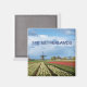 Souvenir photo magnet with a landscape with a windmill and yellow and red tulips under a cloudy sky in the Dutch countryside on a beautiful springtime day in the Bulb Region, the Netherlands with the text: 'The Netherlands'.