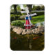 A cute windmill as a decoration in a garden setting. A pond below showing the reflection of the windmill with fish. Photo taken April 2018.