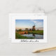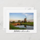 Postcard of a windmill next to a small ditch with a bridge at the edge of a big meadow in the dutch countryside at sunset in Aarlanderveen, the Netherlands with a white frame and the text: 'Netherlands'.