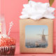 Square sticker of a traditional dutch windmill covered in snow in a rural landscape in Aarlanderveen, the Netherlands, in winter in the warm early morning light at sunrise. A great souvenir!