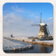 Paper photo coaster with a windmill next to a small river in the sunlight of a cold winter morning in a dutch countryside landscape with snow in the Netherlands.