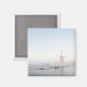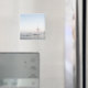 Souvenir fridge magnet of a windmill in the snow next to a canal during a foggy sunrise in winter in the Netherlands