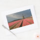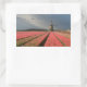 Rectangular photo sticker of a landscape with a windmill and pink tulip flowers in rows on a bulb farm under a grey sky in the countryside in the Netherlands in spring.