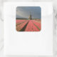 Photo sticker with a landscape with a windmill and pink tulip flowers in rows on a bulb farm under a grey sky in the countryside in the Netherlands in spring.