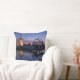 Throw pillow with two illuminated windmills and a drawbridge with reflection in the water of the canal in the last light at sunset in Kinderdijk in the Netherlands.