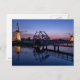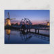 Postcard of two illuminated windmills and a drawbridge with reflection in the water of the canal in the last light at sunset in Kinderdijk in the Netherlands.