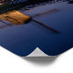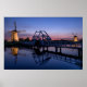 Poster print of two illuminated windmills and a drawbridge with reflection in the water of the canal in the last light at sunset in Kinderdijk in the Netherlands.
