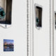 Souvenir photo magnet with two illuminated windmills and a drawbridge with reflection in the water of the canal in the last light at sunset in Kinderdijk in the Netherlands with the text: 'Holland'.