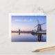 Postcard of a sunrise over the windmills of Kinderdijk in the Netherlands in winter with some snow and ice on the water with the tekst: 'Netherlands'.