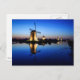 Postcard of historic windmills illuminated at dusk during the Blue Hour with reflection in the water in a landscape in Kinderdijk, the Netherlands.
