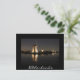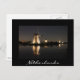Postcard of a landscape with multiple windmills, illuminated at night, with reflection in the still canal water in Kinderdijk, the Netherlands with a black border and the text: 'Netherlands'.