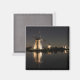 Souvenir photo magnet of a landscape with multiple windmills, illuminated at night, with reflection in the still canal water in Kinderdijk, the Netherlands.