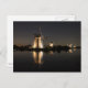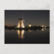 Postcard of a landscape with multiple windmills, illuminated at night, with reflection in the still canal water in Kinderdijk, the Netherlands.