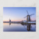 Postcard of a sunrise over the windmills of Kinderdijk in the Netherlands in winter with some snow and ice on the water of the river.